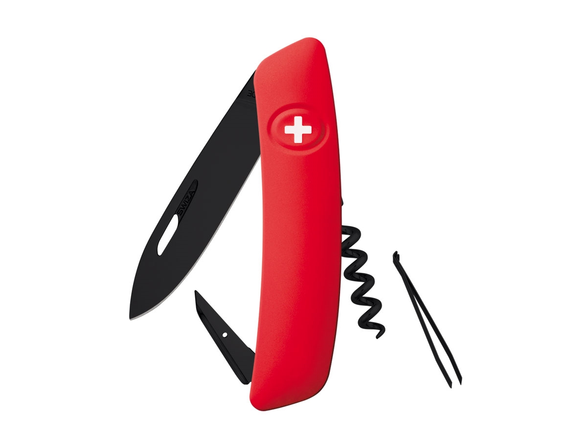 Navaja con la hoja es de acero inoxidable 440 con una dureza de 57 HRC. Se esconde dentro de un mango de 95 mm con cachas de agarre suave. Las cachas garantizan un agarre cómodo. La hoja del cuchillo se desliza fácilmente hacia fuera. Luego se oculta al liberar el seguro. Basta con pulsar el logotipo de Swiza.