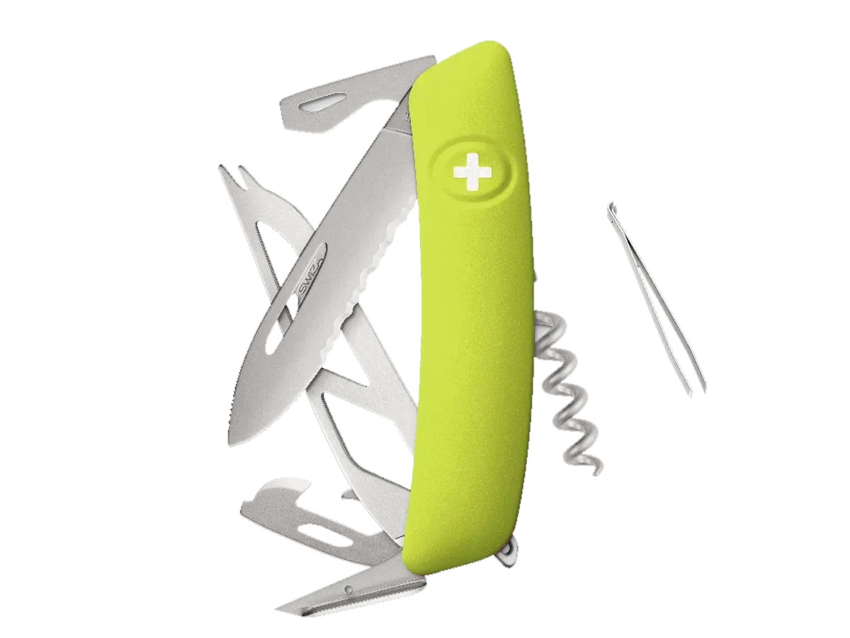 Navaja con la hoja es de acero inoxidable 440 con una dureza de 57 HRC. Se esconde dentro de un mango de 95 mm con cachas de agarre suave. Las cachas garantizan un agarre cómodo. La hoja del cuchillo se desliza fácilmente hacia fuera. Luego se oculta al liberar el seguro. Basta con pulsar el logotipo de Swiza.