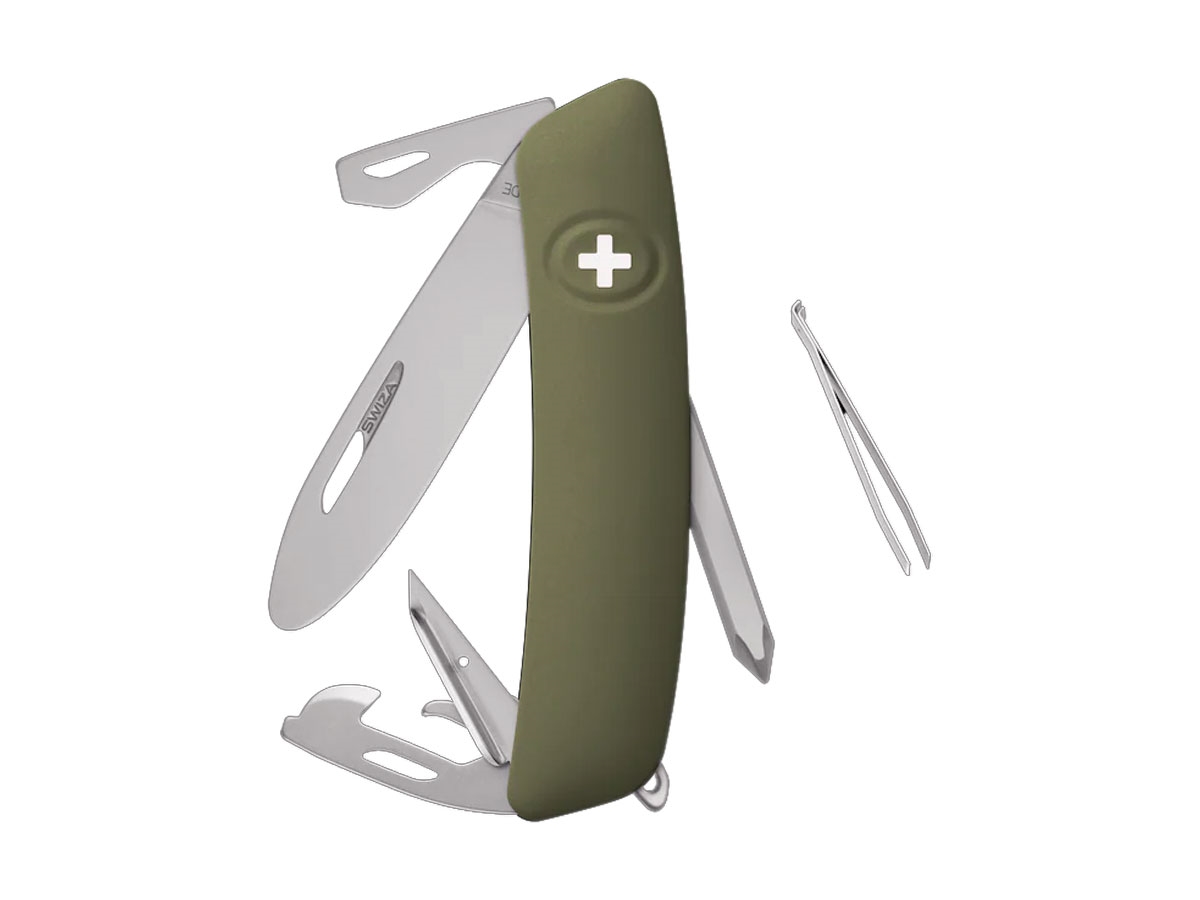 Navaja con la hoja es de acero inoxidable 440 con una dureza de 57 HRC. Se esconde dentro de un mango de 95 mm con cachas de agarre suave. Las cachas garantizan un agarre cómodo. La hoja del cuchillo se desliza fácilmente hacia fuera. Luego se oculta al liberar el seguro. Basta con pulsar el logotipo de Swiza.