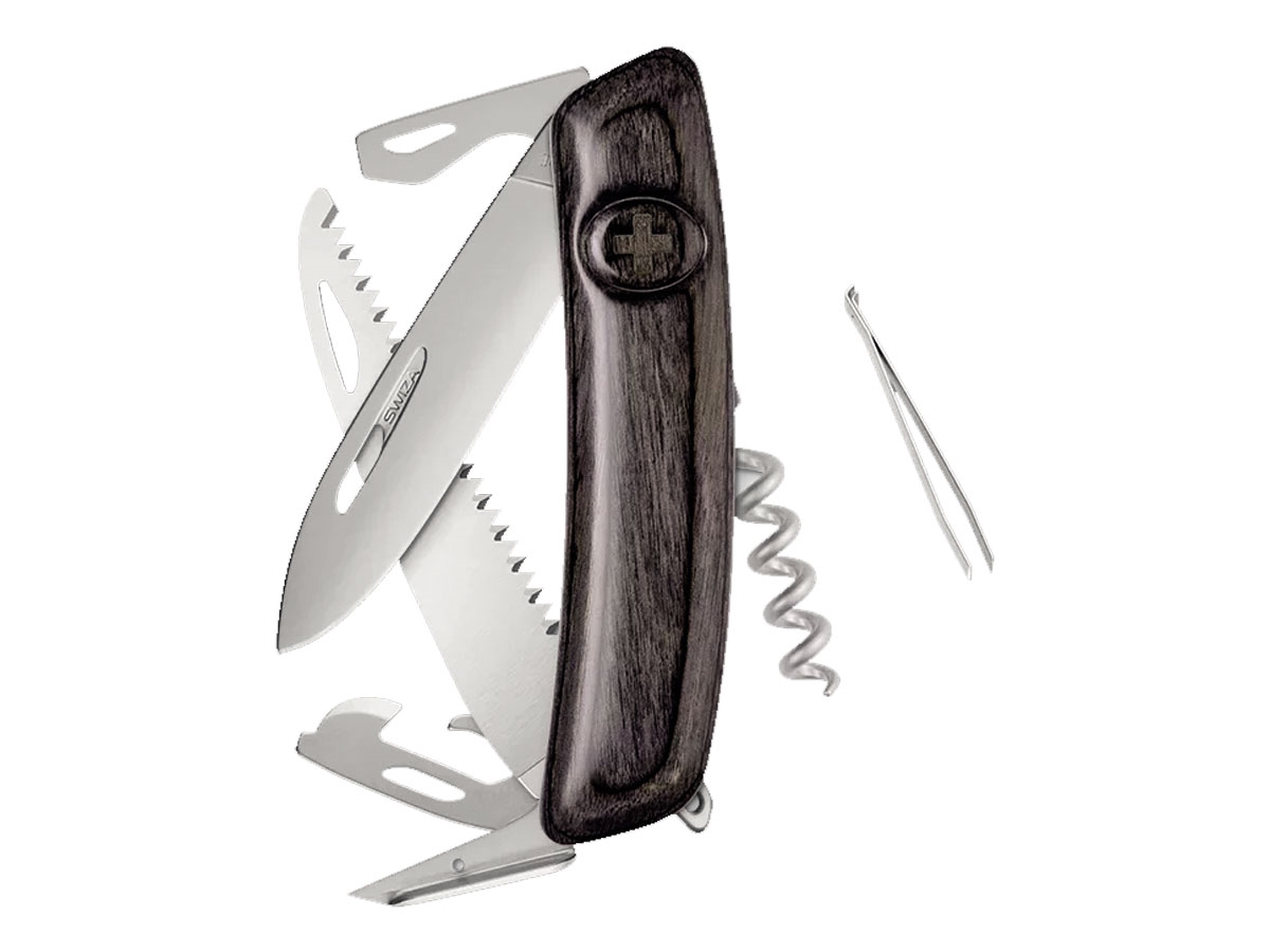 Navaja con la hoja es de acero inoxidable 440 con una dureza de 57 HRC. Se esconde dentro de un mango de 95 mm con cachas de madela laminada negra. Las cachas garantizan un agarre cómodo. La hoja del cuchillo se desliza fácilmente hacia fuera. Luego se oculta al liberar el seguro. Basta con pulsar el logotipo de Swiza.