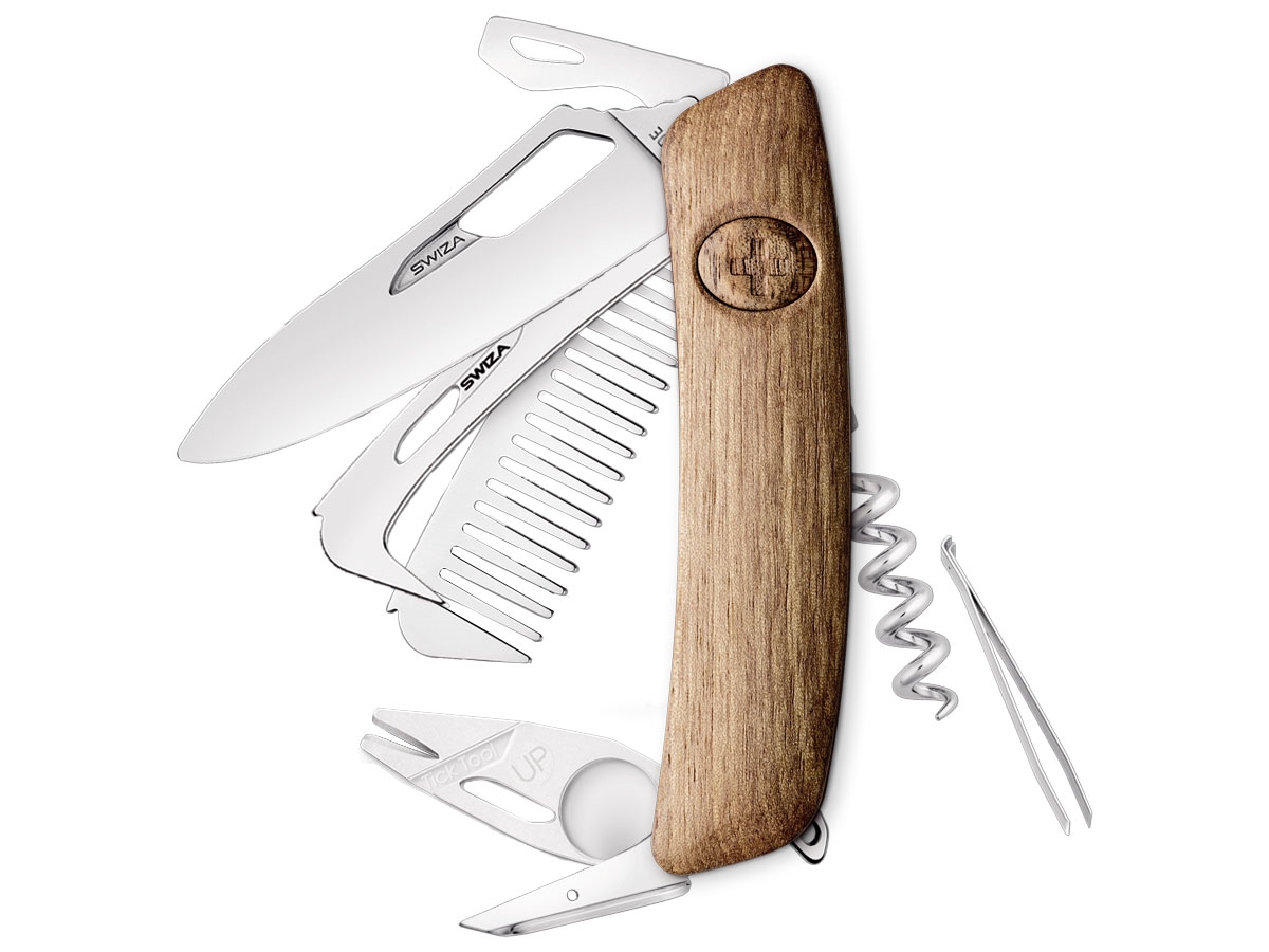 Navaja con la hoja es de acero inoxidable 440 con una dureza de 57 HRC. Se esconde dentro de un mango de 95 mm con cachas de madela de nogal. Las cachas garantizan un agarre cómodo. La hoja del cuchillo se desliza fácilmente hacia fuera. Luego se oculta al liberar el seguro. Basta con pulsar el logotipo de Swiza.