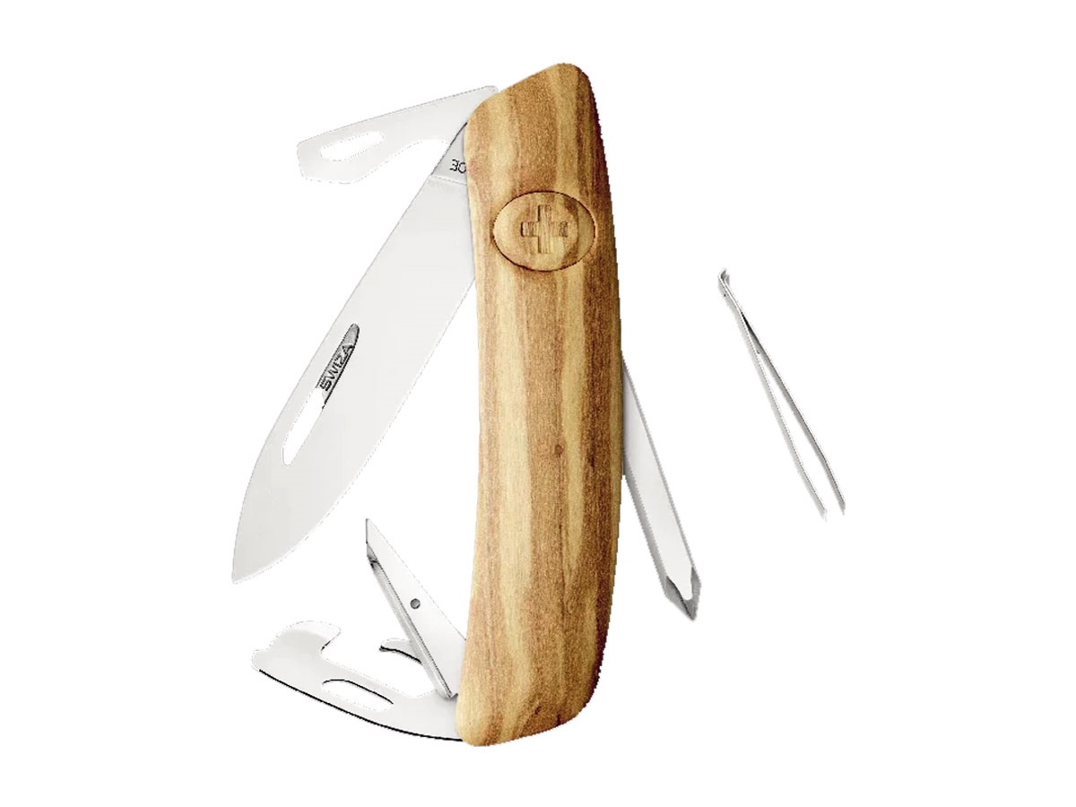 Navaja con la hoja es de acero inoxidable 440 con una dureza de 57 HRC. Se esconde dentro de un mango de 95 mm con cachas de madela de olivo. Las cachas garantizan un agarre cómodo. La hoja del cuchillo se desliza fácilmente hacia fuera. Luego se oculta al liberar el seguro. Basta con pulsar el logotipo de Swiza.