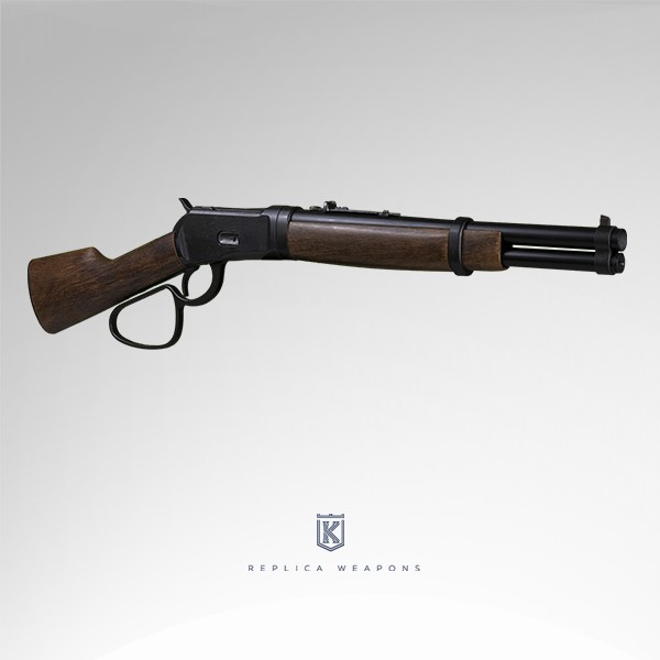 Réplica rifle Winchester en acabado color dorado. Esta réplica de Kolser cuenta con unas medidas y peso que le confieren realismo, además de un mecanismo funcional y una recámara recargable para las imitaciones de balas fabricadas en Kolser que admiten fulminantes.