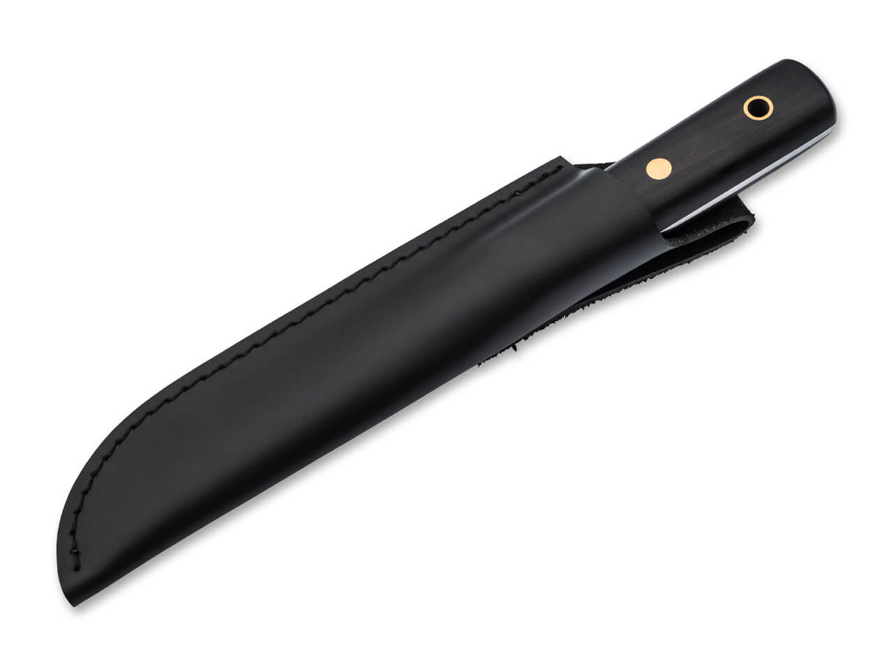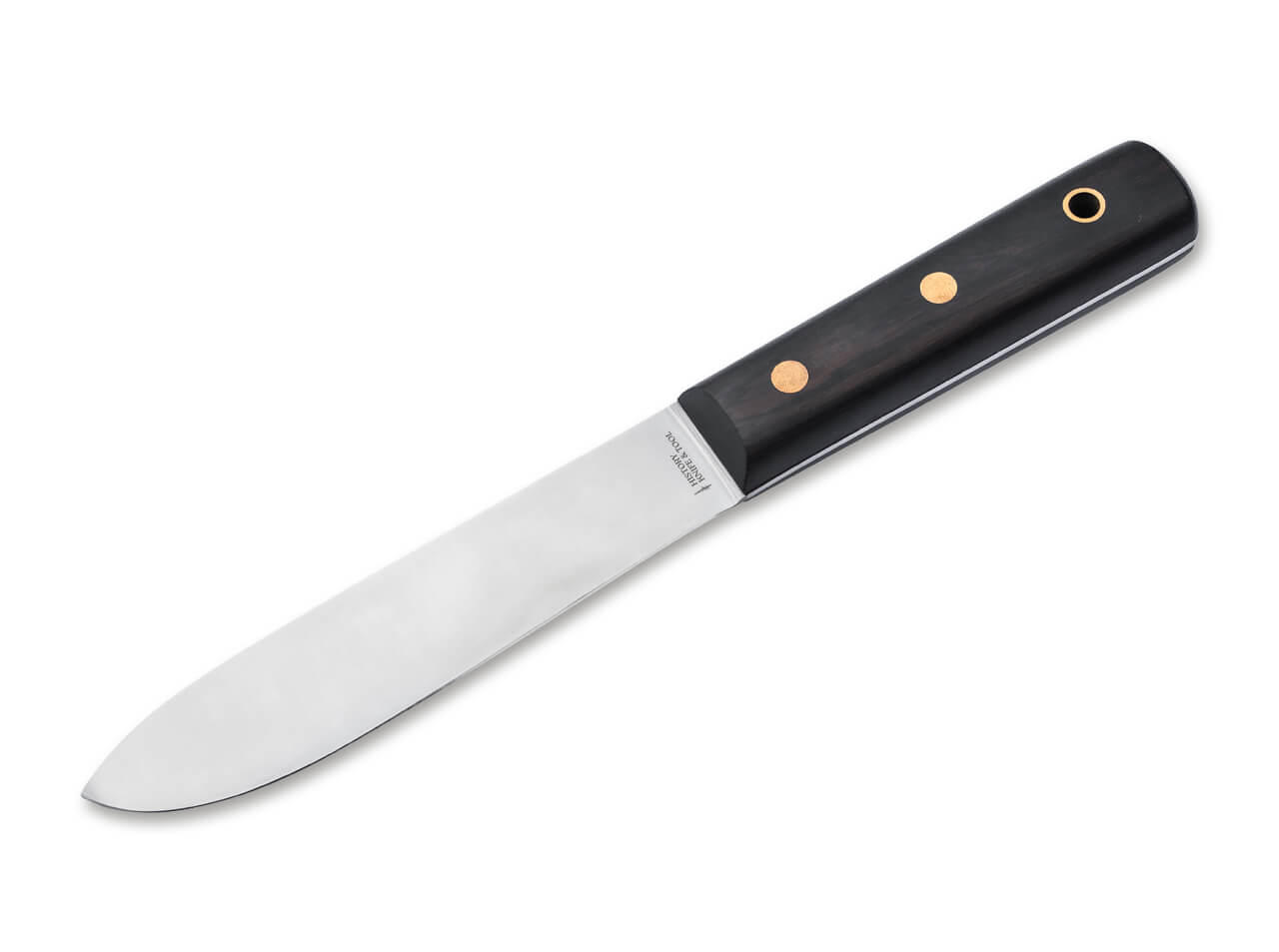 El cuchillo marinero History Knife & Tool es el cuchillo central y original de la marina mercante internacional. La marina alemana aún utiliza estos cuchillos con mínimas variaciones; las especificaciones se recogen en la especificación técnica de suministro TL 5110-0026. El cuchillo parece modesto a primera vista, pero es precisamente su forma arquetípica y sencilla la que garantiza su alta funcionalidad y aplicabilidad universal. Todos los cuchillos marineros, independientemente del fabricante, cuentan tradicionalmente con mangos de ébano resistentes al agua salada con dos remaches de latón y un orificio para cordón con ribete de latón, así como una robusta funda de cuero negro con trabilla para cinturón. La pieza central es la hoja fina, plana, mayormente recta y ligeramente bulbosa de punta caída . Cabe mencionar un nombre en relación con el "Navaja del Marinero" debido a su sorprendente similitud: Horace Sowers Kephart (1862-1931) fue un escritor de viajes y actividades al aire libre y, junto con George Washington Sears y Henry David Thoreau, es considerado uno de los pioneros y precursores del bushcraft moderno. El cuchillo Kephart, desarrollado por él y ahora aclamado por los expertos, comparte un gran parecido con el "Navaja del Marinero" en sus contornos exteriores. Hoy en día, no es posible determinar si la inspiración fluyó entre ambos cuchillos ni en qué dirección. Quizás la similitud se deba simplemente a la simplicidad arquetípica y la funcionalidad inquebrantable de su diseño.