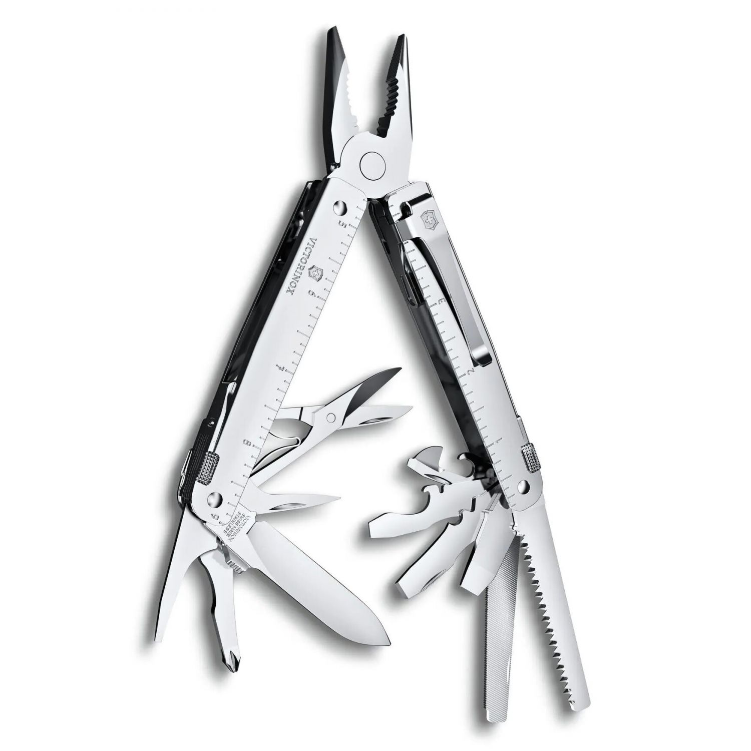 Alicate multiuso de punta fina / Corte para alambre delgado y suave hasta 40 HRC / Corte para alambre endurecido / Prensa terminales / Hoja grande / Abrelatas / Destornillador 3 mm / Destapador / Destornillador 5 mm / Curvador de alambres / Destornillador 7.5 mm / Palanca, resistente / Broche para transportar / Destornillador 2 mm / Punzón escariador / Tijeras / Sierra para madera / Sierra para metal / Lima metálica / Destornillador Phillips 1/2 / Regla (cm) / Regla (pulgadas) / Formón de 7 mm y raspador / Pela cables / Pela cables / Ojal de fijación / Coupling for corkscrew and carry clip