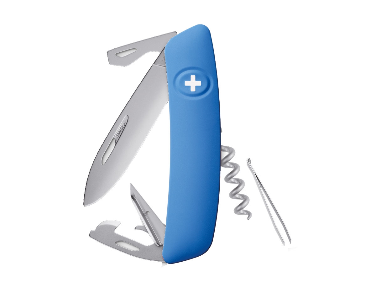 Navaja con la hoja es de acero inoxidable 440 con una dureza de 57 HRC. Se esconde dentro de un mango de 95 mm con cachas de agarre suave. Las cachas garantizan un agarre cómodo. La hoja del cuchillo se desliza fácilmente hacia fuera. Luego se oculta al liberar el seguro. Basta con pulsar el logotipo de Swiza.
