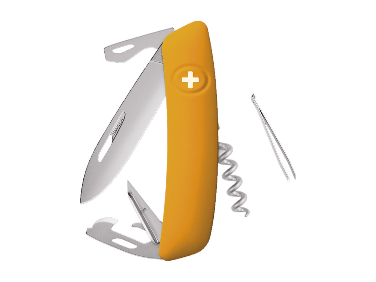 Navaja con la hoja es de acero inoxidable 440 con una dureza de 57 HRC. Se esconde dentro de un mango de 95 mm con cachas de agarre suave. Las cachas garantizan un agarre cómodo. La hoja del cuchillo se desliza fácilmente hacia fuera. Luego se oculta al liberar el seguro. Basta con pulsar el logotipo de Swiza.