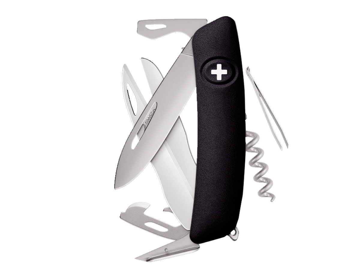 Navaja con la hoja es de acero inoxidable 440 con una dureza de 57 HRC. Se esconde dentro de un mango de 95 mm con cachas de agarre suave. Las cachas garantizan un agarre cómodo. La hoja del cuchillo se desliza fácilmente hacia fuera. Luego se oculta al liberar el seguro. Basta con pulsar el logotipo de Swiza.