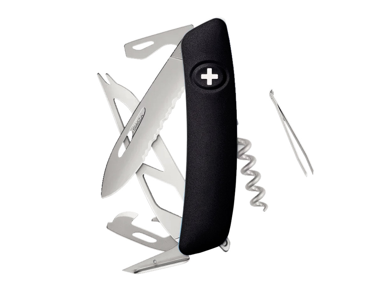 Navaja con la hoja es de acero inoxidable 440 con una dureza de 57 HRC. Se esconde dentro de un mango de 95 mm con cachas de agarre suave. Las cachas garantizan un agarre cómodo. La hoja del cuchillo se desliza fácilmente hacia fuera. Luego se oculta al liberar el seguro. Basta con pulsar el logotipo de Swiza.
