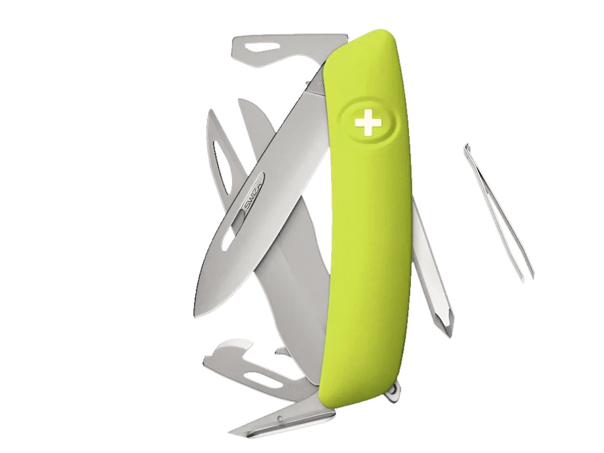 Navaja con la hoja es de acero inoxidable 440 con una dureza de 57 HRC. Se esconde dentro de un mango de 95 mm con cachas de agarre suave. Las cachas garantizan un agarre cómodo. La hoja del cuchillo se desliza fácilmente hacia fuera. Luego se oculta al liberar el seguro. Basta con pulsar el logotipo de Swiza.
