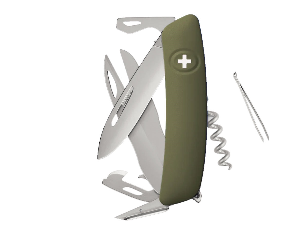Navaja con la hoja es de acero inoxidable 440 con una dureza de 57 HRC. Se esconde dentro de un mango de 95 mm con cachas de agarre suave. Las cachas garantizan un agarre cómodo. La hoja del cuchillo se desliza fácilmente hacia fuera. Luego se oculta al liberar el seguro. Basta con pulsar el logotipo de Swiza.