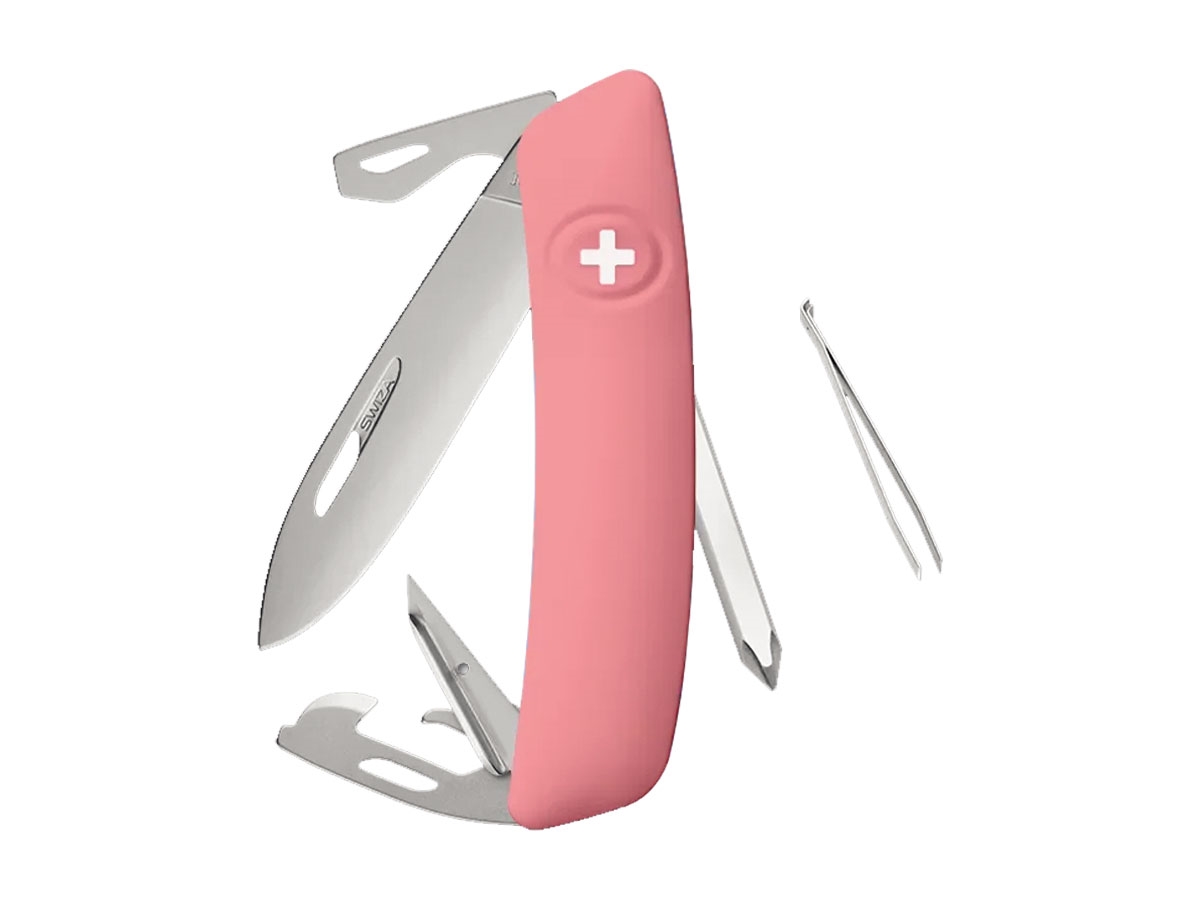Navaja con la hoja es de acero inoxidable 440 con una dureza de 57 HRC. Se esconde dentro de un mango de 95 mm con cachas de agarre suave. Las cachas garantizan un agarre cómodo. La hoja del cuchillo se desliza fácilmente hacia fuera. Luego se oculta al liberar el seguro. Basta con pulsar el logotipo de Swiza.
