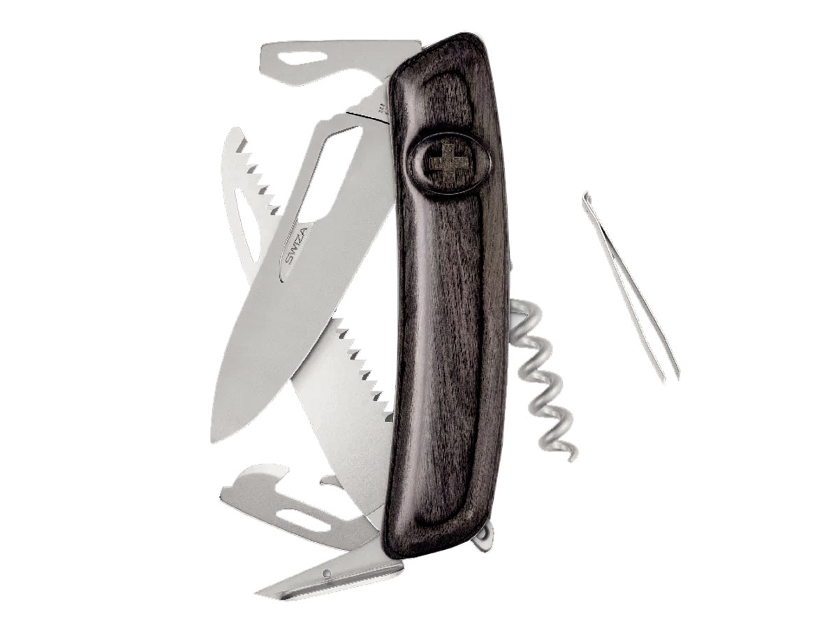 Navaja con la hoja es de acero inoxidable 440 con una dureza de 57 HRC. Se esconde dentro de un mango de 95 mm con cachas de madela laminada negra. Las cachas garantizan un agarre cómodo. La hoja del cuchillo se desliza fácilmente hacia fuera. Luego se oculta al liberar el seguro. Basta con pulsar el logotipo de Swiza.