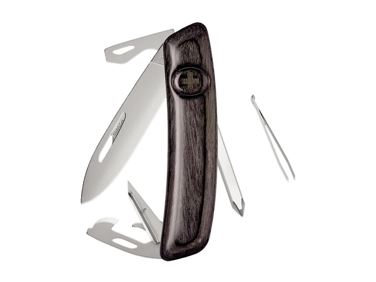 Navaja con la hoja es de acero inoxidable 440 con una dureza de 57 HRC. Se esconde dentro de un mango de 95 mm con cachas de madela laminada negra. Las cachas garantizan un agarre cómodo. La hoja del cuchillo se desliza fácilmente hacia fuera. Luego se oculta al liberar el seguro. Basta con pulsar el logotipo de Swiza.