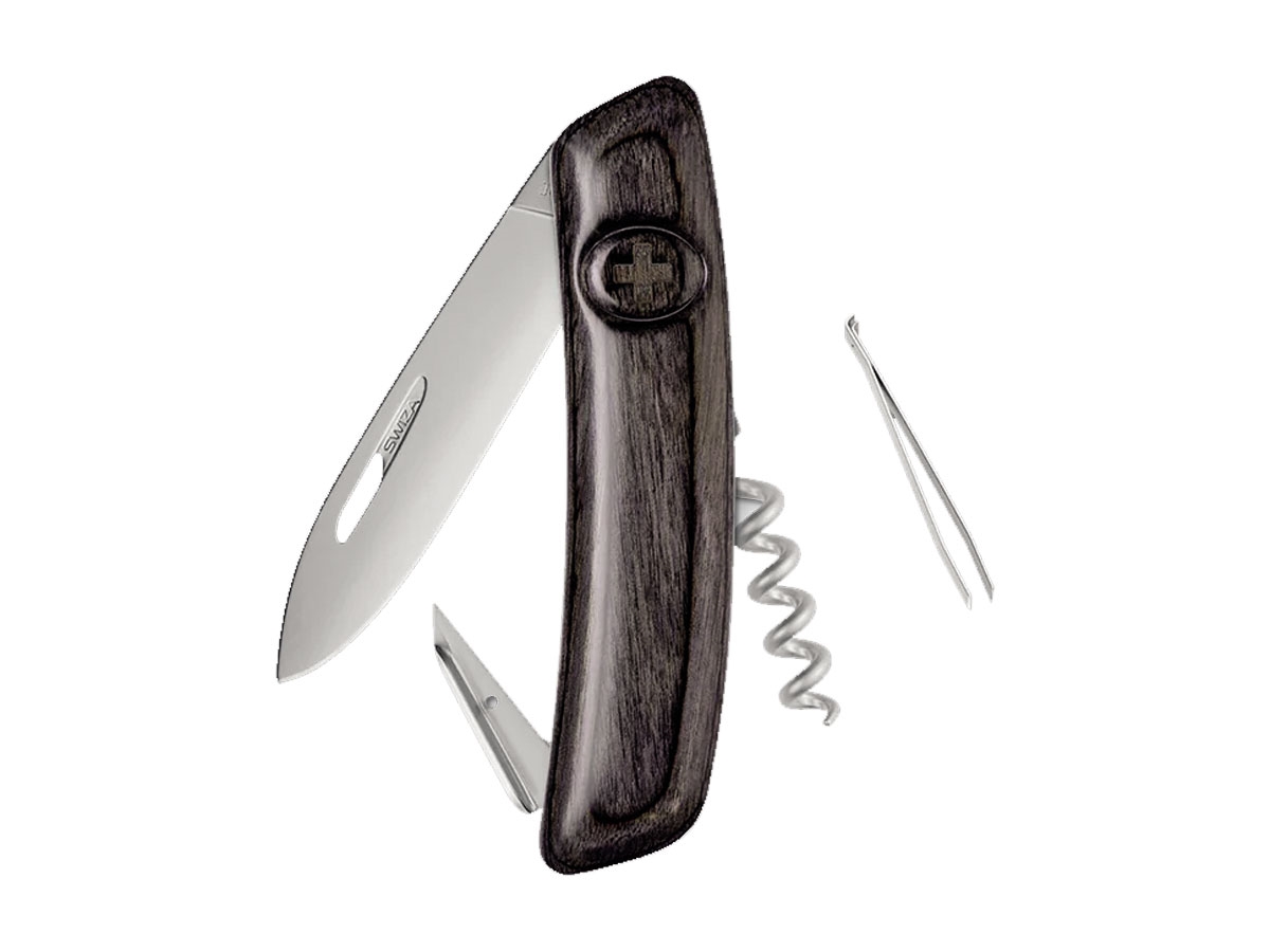 Navaja con la hoja es de acero inoxidable 440 con una dureza de 57 HRC. Se esconde dentro de un mango de 95 mm con cachas de madela laminada negra. Las cachas garantizan un agarre cómodo. La hoja del cuchillo se desliza fácilmente hacia fuera. Luego se oculta al liberar el seguro. Basta con pulsar el logotipo de Swiza.