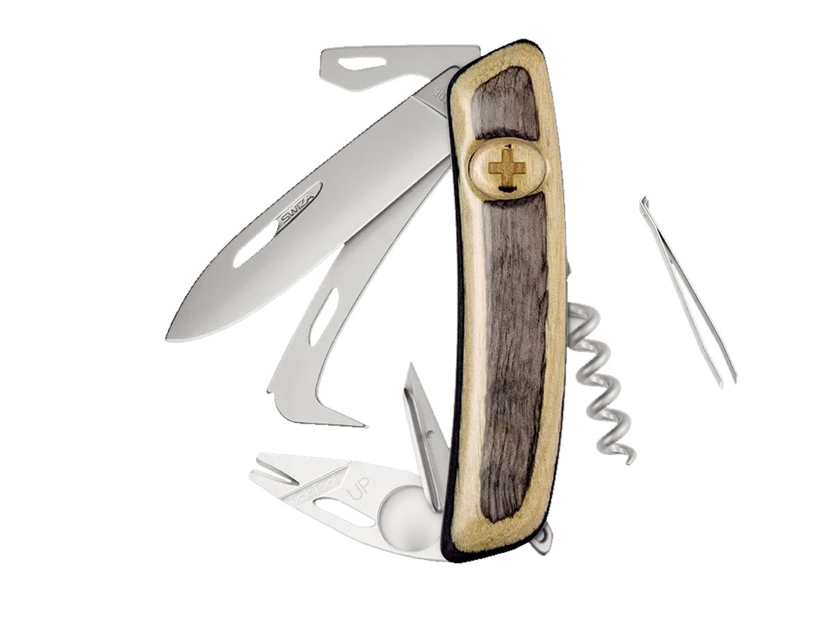 Navaja con la hoja es de acero inoxidable 440 con una dureza de 57 HRC. Se esconde dentro de un mango de 95 mm con cachas de madela laminada blanca. Las cachas garantizan un agarre cómodo. La hoja del cuchillo se desliza fácilmente hacia fuera. Luego se oculta al liberar el seguro. Basta con pulsar el logotipo de Swiza.