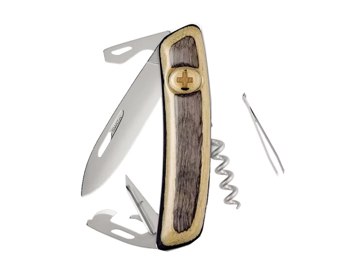 Navaja con la hoja es de acero inoxidable 440 con una dureza de 57 HRC. Se esconde dentro de un mango de 95 mm con cachas de madela laminada blanca. Las cachas garantizan un agarre cómodo. La hoja del cuchillo se desliza fácilmente hacia fuera. Luego se oculta al liberar el seguro. Basta con pulsar el logotipo de Swiza.