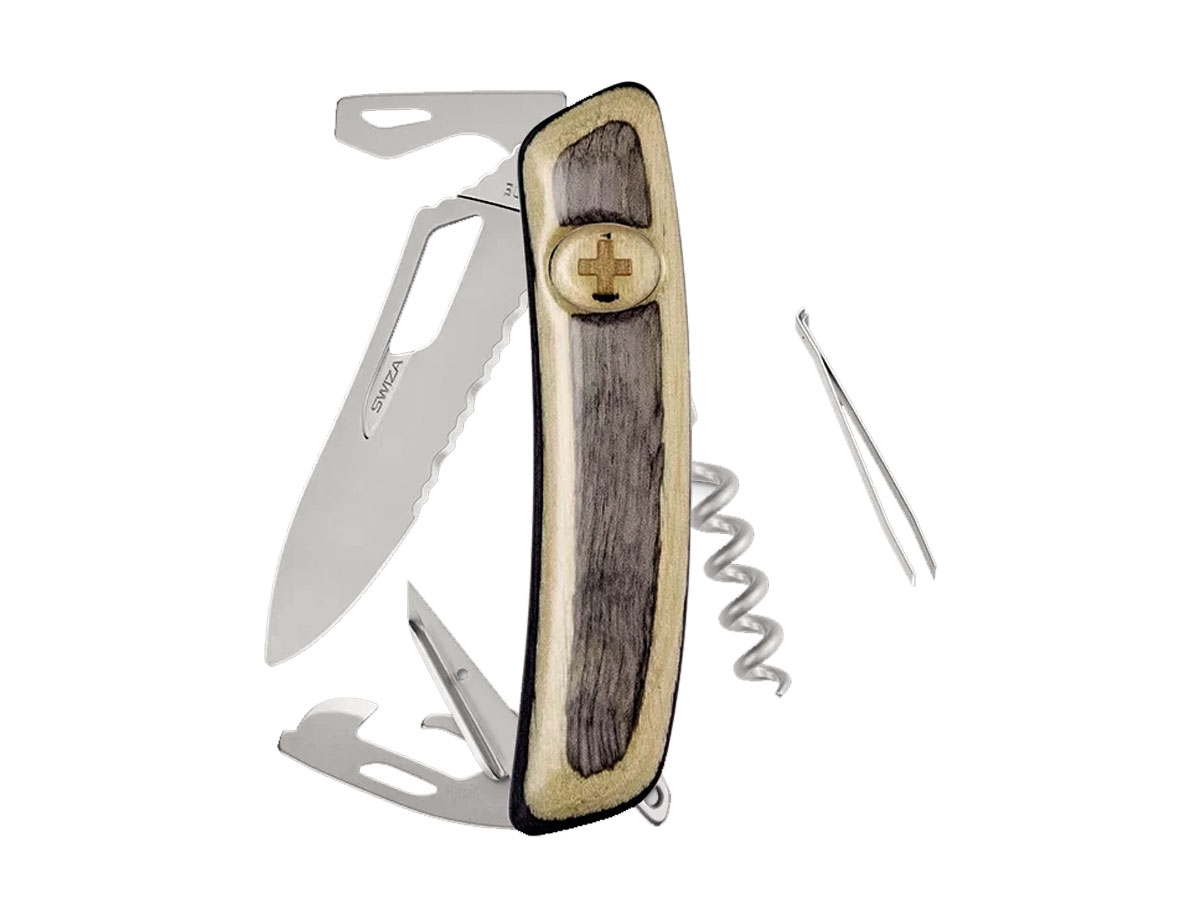 Navaja con la hoja es de acero inoxidable 440 con una dureza de 57 HRC. Se esconde dentro de un mango de 95 mm con cachas de madela laminada blanca. Las cachas garantizan un agarre cómodo. La hoja del cuchillo se desliza fácilmente hacia fuera. Luego se oculta al liberar el seguro. Basta con pulsar el logotipo de Swiza.