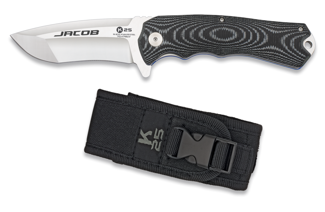 Características ProductoNavaja NombreJACOB MarcaK25 Tamaño de la Hoja8.80 cm Tamaño del Mango12.00 cm Tamaño Total20.80 cm Tipo de AceroInox 7Cr17Mov Tipo de HojaNormal AcabadoSatin (CNC) SierraSin Sierra Grosor de la Hoja3.15 mm Usos0 FiloUno Solo Tipo de MangoG10 (CNC) EnterizoNo Tipo de FundaNylon Con Virola (Tipo)No Con ClipNo TetónNo FliperSi ForrosAcero Ball BearingNo CNCSi Corta Cinturón una CuchillaNo Corta Cinturón doble CuchillaNo Rompecristales AceroNo Rompecristales TungstenoNo Tipo de BloqueoLiner Lock Peso170.00 g PresentaciónCaja color K25 Apertura asistidaNo Diseñado en EspañaSi NovedadNo PersonalizableNo