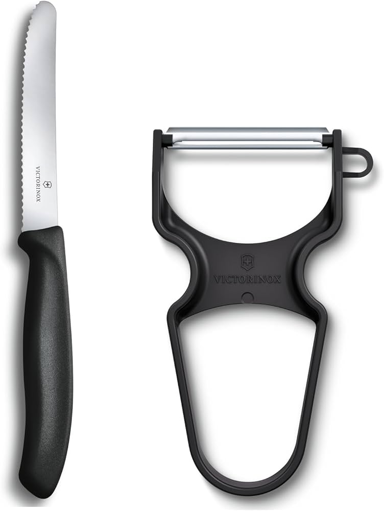 - 1 cuchillo de mesa/tomate, hoja dentada de acero inoxidable de 11 cm, punta redonda, mango negro (Ref. 6.7833),- Pelador “RAPID” negro con hoja lisa (Ref. 6.0930.3).