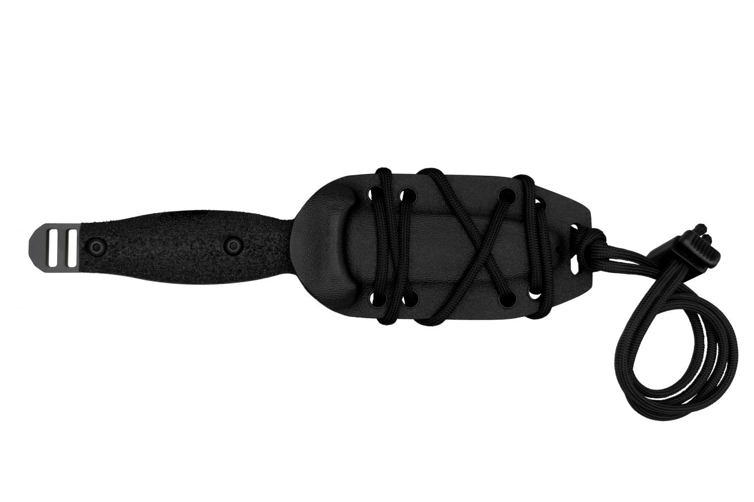 El cuchillo viene con una funda de Kydex completa con paracord para sujeción al cinturón, sistemas MOLLE y correas. Se pueden aplicar varios sistemas de sujeción a la plataforma de la funda como accesorios opcionales, que se venden por separado.