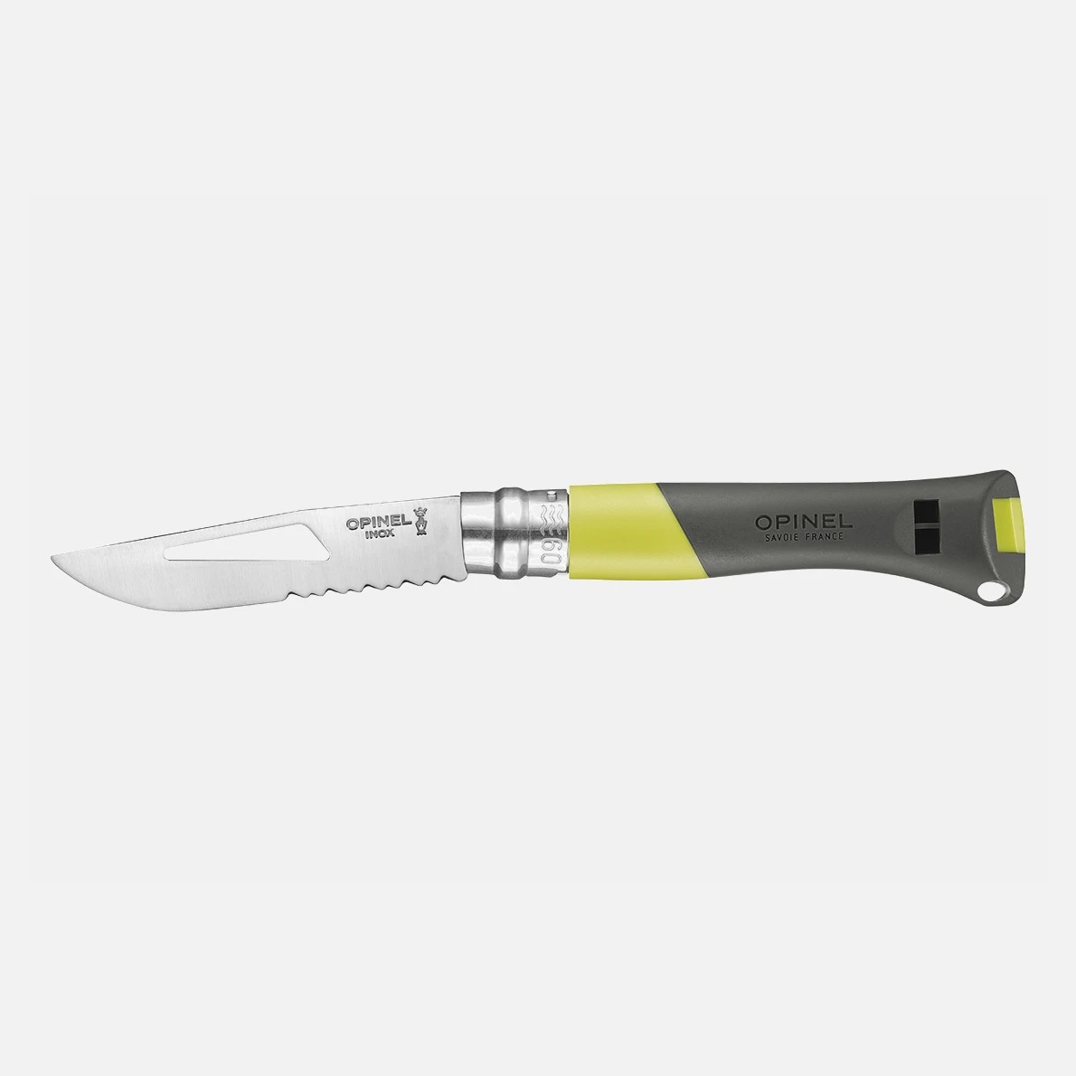 El Nº09 Ocean Amarillo es muy versátil: cuenta con una hoja resistente de 9 cm de acero inoxidable semi dentada para cortar sin arrancar las cuerdas naturales o sintéticas, y está provista de un llave para grilletes. Su mango de poliamida es resistente al agua, a los golpes y a las temperaturas extremas. Está equipado con un silbato y un orificio para cordón, así como con un punzón marinero de acero templado para desatar, separar o trabajar cabos sin cortarlas.