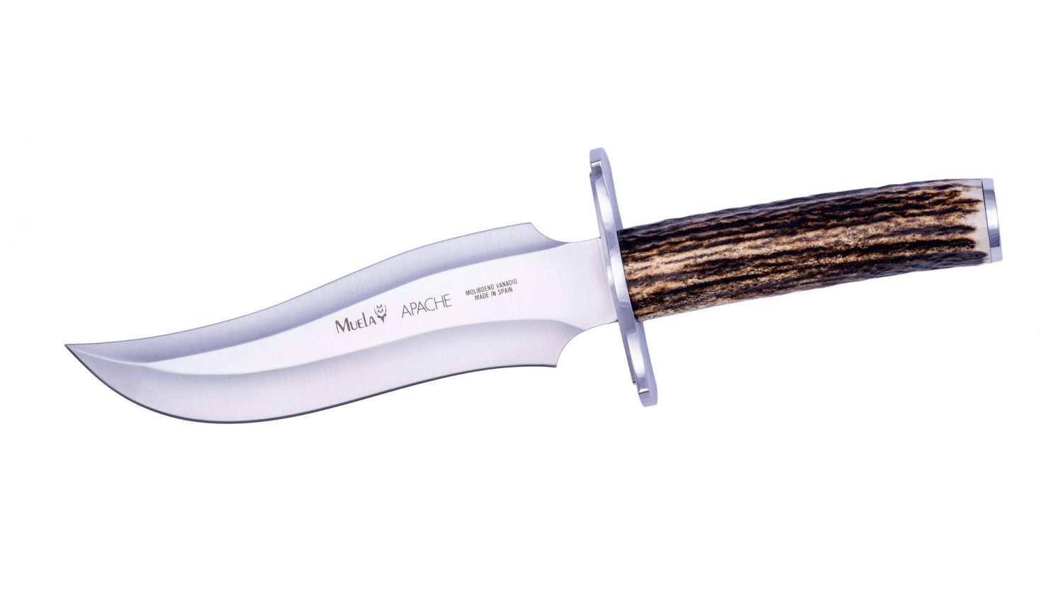 Se trata de un cuchillo Muela de hoja enteriza, con acero inoxidable X50CrMoV15, con una longitud de hoja de 190mm, su mango es de cuerno de ciervo, incluye funda de cuero para este.